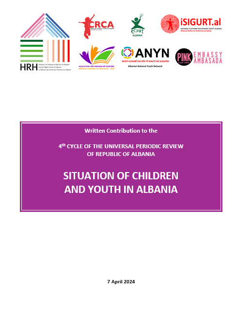 The Report was submitted as a written contribution on the children and youth rights situation in Albania for the 4th cycle of UPR reporting. It provides information on child and youth education, poverty, violence, social protection, health, and access to justice, including information on children and youth belonging to minorities and the LGBTIQ community in Albania. The Report is a contribution of a consortium of organisations, part of the Human Rights House Albania, respectively CRCA/ECPAT Albania, National Platform for Safer Internet in Albania, Albanian Coalition for Education, Albanian National Youth Network and PINK Embassy Albania.